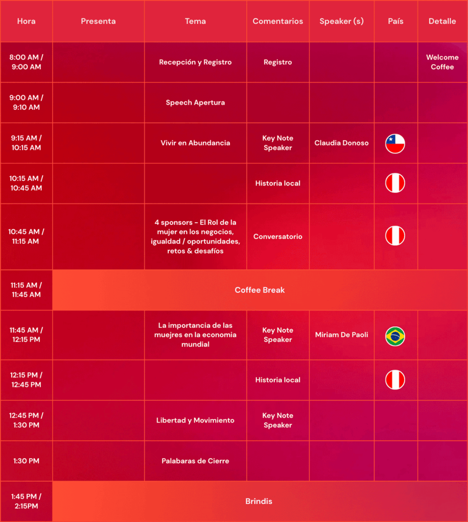 Aquí reconocemos a líderes que transforman negocios y sociedad, impulsan innovación y construyen un futuro sostenible. Será una jornada con aprendizajes de referentes internacionales y casos locales que muestran cómo el liderazgo femenino marca la diferencia en el Perú y la región.